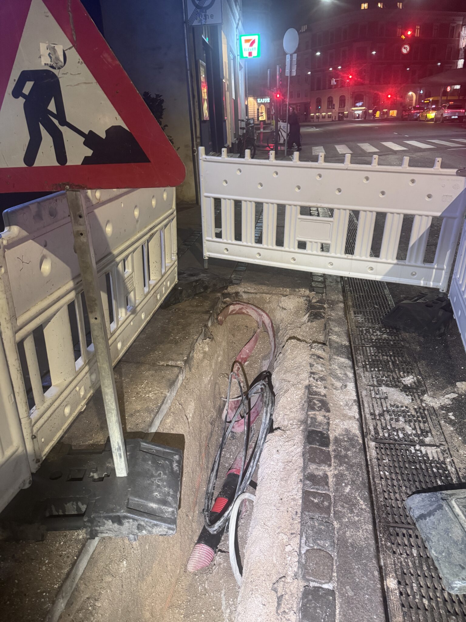 Under et asfaltskærearbejde blev nogle kommunikations-ledninger skåret over på tværs. Ledningerne lå 21 cm under asfalten, målt til overkant af ledningerne